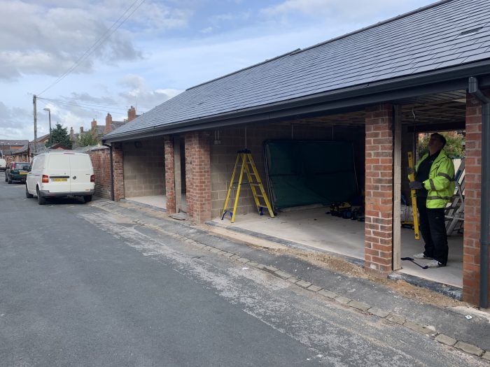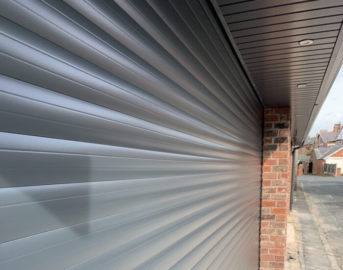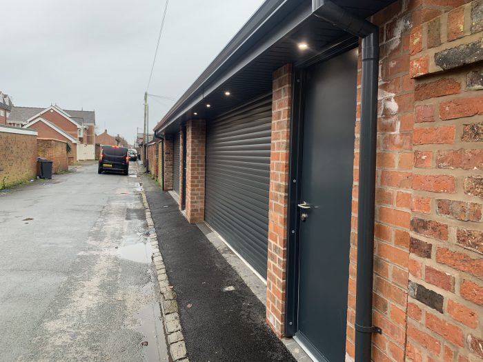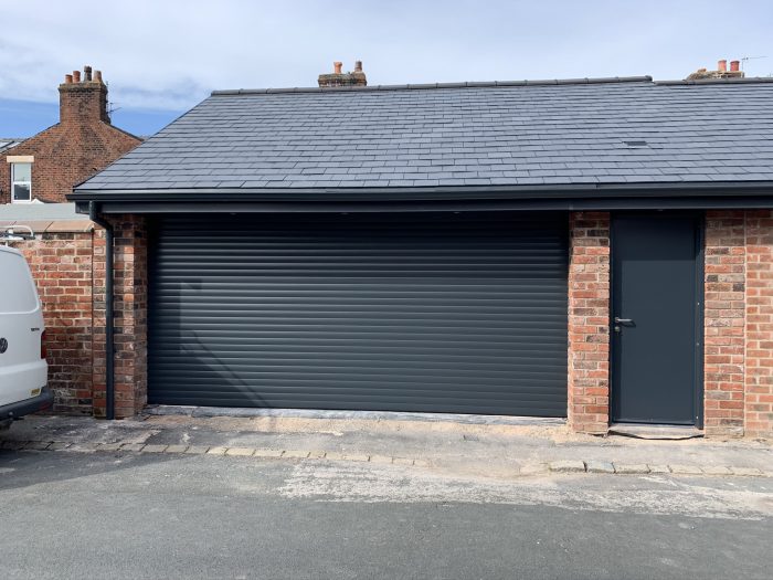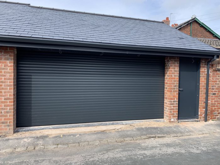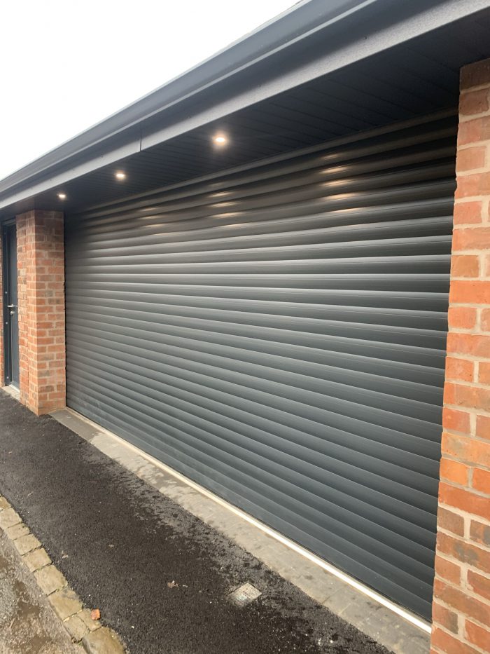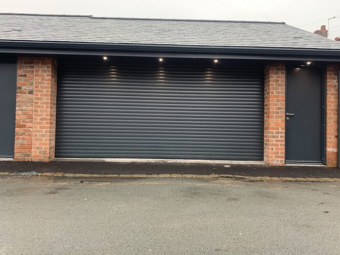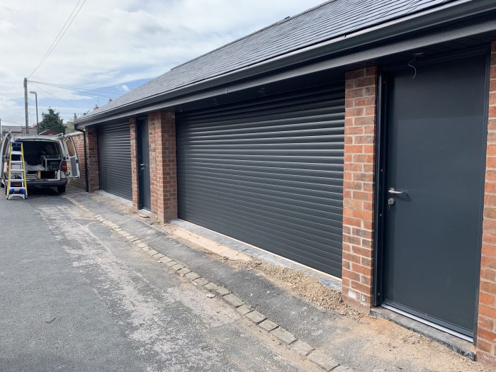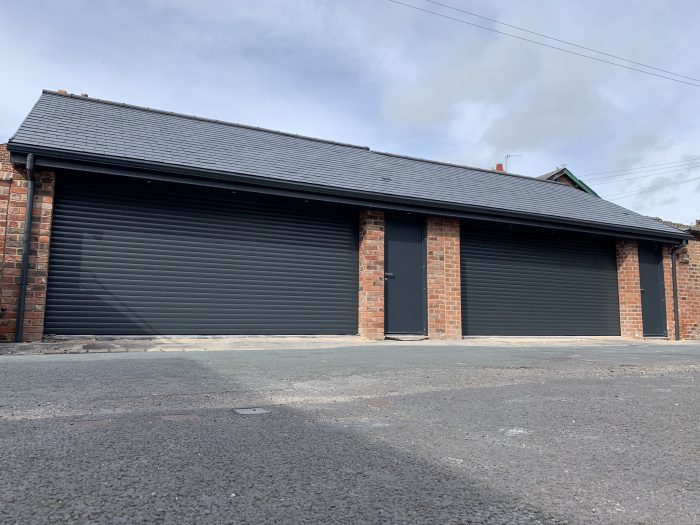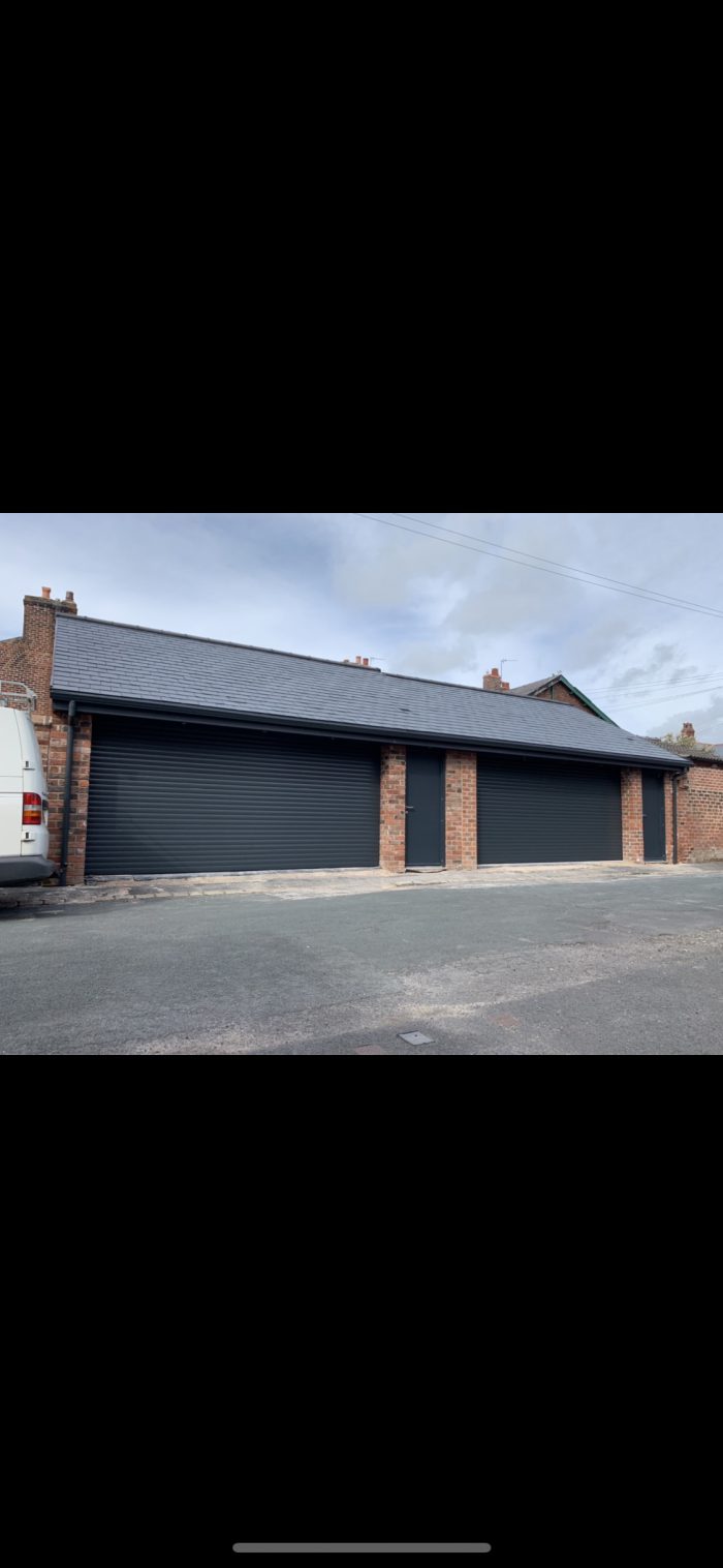 2 x insulated aluminium roller garage doors 2 x steel hinged personnel doors All in anthracite Access via GSM Dialler controlled via mobile phone